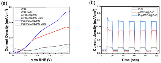 Photoelectrochemical test under solar irradiation of AM 1.5 (100 mW/cm2) for three different photoanodes: ZnO, p-PCDA@ZnO, and Pt/p-PCDA@ZnO; (a) LSV curve with current densities at “light” and “dark” modes and (b) chronoamperometry under alternating “light” and “dark” modes 10 s each.