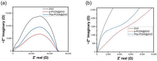 (a) Electrochemical impedance spectroscopy (EIS) of ZnO nanoflowers, p-PCDA@ZnO, and Pt@p-PCDA@ZnO photoanodes, and (b) the enlarged region (up to 10,000 Ω) where the double arcs were connected.