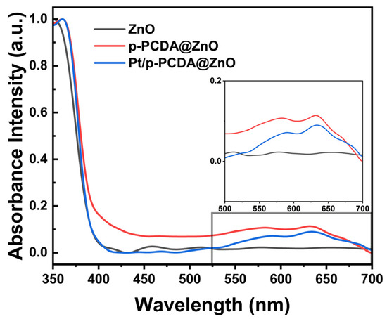 Absorbance intensity of the bare ZnO nanoflowers and p-PCDA@ZnO and Pt/p- PCDA@ZnO photoanodes at wavelengths ranging from 350 nm to 700 nm. Inset: enlarged absorbance intensities data in the visible range (wavelength range of 500~700 nm). The effect of the p-PCDA layer can be seen, with peak absorbance intensities at 589 nm and 633 nm.