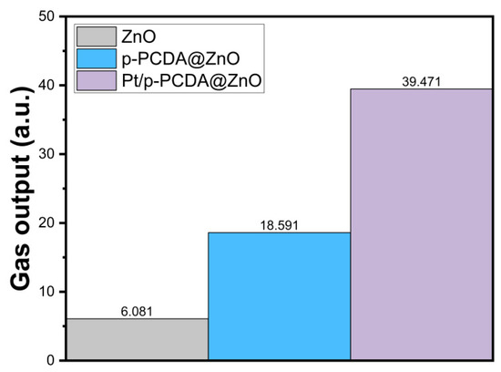 We also measured how much oxygen gas can be obtained from the bare ZnO nanoflowers and p-PCDA@ZnO and Pt/p-PCDA@ZnO photoanodes under simulated solar irradiation of 100 mW/cm2 (AM 1.5). We measured the amount of oxygen gas, because the gases produced from the photoanode and the cathode are oxygen and hydrogen, respectively. We believe that the amount of oxygen gas released from the photoanode must be proportional to that of the hydrogen gas produced on the cathode. Therefore, it is reasonable to estimate the amount of hydrogen produced based on the amount of oxygen released. The gas evolution measurement system was the same as the PEC measurement system, which consists of three electrodes that are photoanodes, Ag/AgCl as a reference electrode, and Pt mesh as a counter electrode. The gas production performance of the three different photoanodes was recorded for 10 min, and screenshots of the end stage of the gas production are provided as Supplementary Information in Figure S6. The amount of gas produced from the photoanode was estimated by using images from the video recording. The amount of produced gas was estimated by counting the number of pixels under gas bubbles in each frame of the images. While the size of the photoanodes remains the same, the frame of the images is slightly different. Therefore, normalization was carried out for the gas output estimations. Figure 7 shows the amount of gas production (arbitrary units) within 10 min, and we can clearly see in this figure that the gas produced from Pt/p-PCDA photoanode is the highest. It is about two and six times higher than that from the p-PCDA@ZnO photoanode and the bare ZnO nanoflower photoanode, respectively.