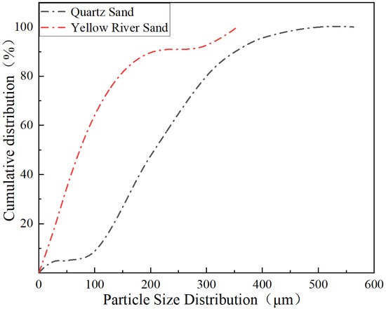 The YRS used in the test was sourced from the grit chamber of the Yellow River Diversion Project in Puyang City, Henan Province, China. Initially wet, it was directly used as raw material after drying. The quartz sand used in the test was provided by Henan Zhongbang Environmental Protection Technology Co., Ltd., (Zhengzhou, China). The particle size is 80~120 mesh. According to the standard of sand and stone quality and test methods for ordinary concrete [42] (JGJ 52-2006), various technical properties including apparent density, bulk density, saturated surface dry water absorption rate, and specific surface area of quartz sand and YRS were tested and are detailed in Table 2. The particle size of the two kinds of sand was analyzed by the Malvern Mastersizer-2000 laser particle size analyzer. The YRS particle size range is 0 to 355 μm, and the quartz sand particle size range is 0–565 μm, as depicted in Figure 1. Among them, the D10 of quartz sand is 105.7 (the particles below 105.7 μm account for 10%, the same below), D25 is 150.4, D50 is 204.9, D75 is 249.8, and D90 is 348.5. D10 of YRS is 10.5, D25 is 38.1, D50 is 69.0, D75 is 110.2, and D90 is 157.4. Overall, the D [3,2] (surface area average particle size, the same as below) of quartz sand is 82.2 μm, and the D [4,3] (volume average particle size, the same as below) is 214.5 μm; the D [3,2] of the YRS is 13.8 μm, and the D [4,3] is 79.2 μm. The particle size of the YRS is finer than that of quartz sand, and the particle size distribution is more concentrated.