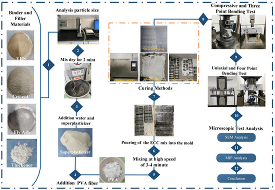 The ECC specimens were prepared using a Lifeng planetary strong mixer. The specific pouring process was as follows: Firstly, all cement, fly ash, and sand were added sequentially and dry mixed at low speed for 2 min. Secondly, water, water-reducing agent, and a thickening agent were added, followed by medium-speed wet mixing for 2 min. Thirdly, PVA fiber was introduced, and the mixture underwent high-speed stirring for 3 min to ensure uniform fiber distribution. Once the ECC slurry was prepared, it was poured into the test mold twice. The slurry was then compacted using a shaking table and vibrating rod to achieve density, and the surface was covered with a preservative film to prevent water evaporation. After allowing the specimens to stand at room temperature for 48 h, the molds were removed, and the specimens were transferred to different curing environments for further curing. The experimental process and method of the study are shown in Figure 2.