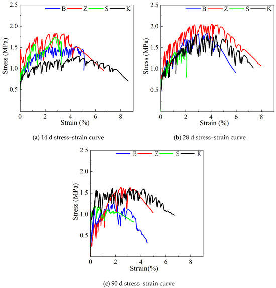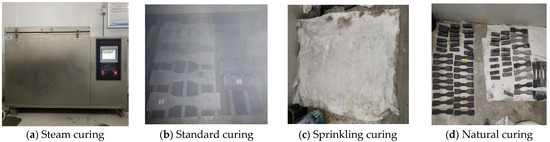 In this experiment, four distinct curing methods were implemented to assess their impact on the ECC specimens: steam curing (Z), standard curing (B), sprinkling curing (S), and natural curing (K), as illustrated in Figure 3. Each method was applied across three different curing ages: 14 days, 28 days, and 90 days. For steam curing (Z), specimens were initially placed in a steam curing box for 3 days post-demolding, followed by transfer to a controlled environment at 20 °C ± 2 °C and 50% relative humidity until reaching the specified curing ages. Standard curing (B) involved immediate placement of specimens post-demolding in a room maintained at 20 °C ± 2 °C with relative humidity exceeding 95%, followed by curing to 14 d, 28 d, and 90 d. Sprinkling curing (S) required specimens to be placed indoors post-demolding and covered with geotextile, receiving morning and evening sprinkling sessions. They were then cured until reaching 14 d, 28 d, and 90 d ages. Lastly, natural curing (K) involved placing specimens in a room with a temperature of 20 °C ± 2 °C and 50% relative humidity immediately after demolding, continuing until 14 d, 28 d, and 90 d ages were achieved. Throughout the study, ‘Z, B, S, and K’ denoted the curing methods, followed by the number indicating the curing age. For example, ‘Z14’ represents the Yellow River sand ECC under 14 d steam curing conditions. In addition, the test also set up traditional sand ECC under standard curing for 28 days, expressed as “B’28”.