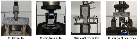 Due to the two-dimensional distribution of fibers in thin plate specimens, which differs from three-dimensional distributions, this study utilized a 160 mm × 40 mm × 40 mm cuboid for the four-point flexural test, with three specimens tested in each group. The tests were conducted on the WDW-20 microcomputer-controlled electronic universal testing machine manufactured by Jinan Hengle Xingke Instrument Co., Ltd., following the guidelines outlined in the specification ‘DBJ61/T 112-2021’ High Ductile Concrete Application Technical Specification [45]. During testing, a dial gauge was positioned beneath the specimen’s mid-span load and connected to the computer for data acquisition. Displacement control loading was employed, with a loading rate set at 0.2 mm/min, as illustrated in Figure 4d. This setup ensured precise control over the loading conditions, facilitating accurate measurement and analysis of the four-point flexural properties of the specimens.