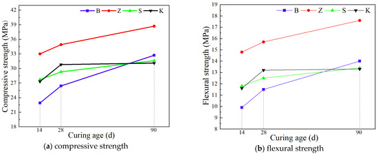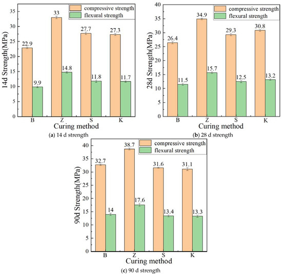 In this study, the 14 d age under each curing method is used as a benchmark to measure the influence of the growth of the curing age on the compressive strength, and the growth rate is calculated. The percentage change in compressive strength under different curing times is shown in Table 6. The effect of different curing ages on the compressive strength of the YRS-ECC is shown in Figure 10.