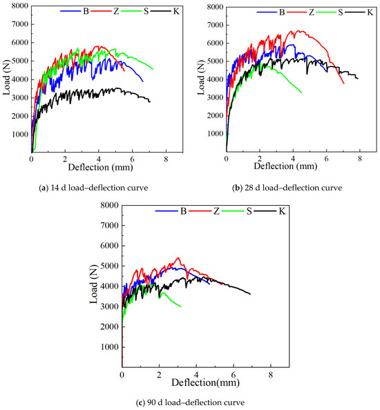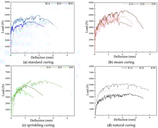 However, at the age is 90 days, ECC specimens under steam curing and standard curing demonstrate similar ultimate flexural loads—5004.82 N and 4912.64 N—and deflections of 3.05 mm and 2.87 mm, respectively. In contrast, specimens under natural curing exhibit a deflection of 4.42 mm and a load of 4473.02 N. Sprinkler curing results in the smallest deflection at 1.56 mm and the lowest ultimate load at 4108.34 N due to varying external water supply. The load–deflection curve further illustrates the extended strain-hardening stage under natural curing conditions compared to sprinkler curing, which limits the increase in ultimate load. These findings highlight the significant influence of curing methods on the flexural performance of YRS-ECC, emphasizing trade-offs between the initial crack resistance, ultimate load capacity, and ductility based on the hydration conditions and water availability during curing. The load–deflection curve (shown in Figure 7c) further confirms this point. The strain-hardening stage under natural curing conditions is significantly longer than that under watering curing conditions, which indicates that a shorter strain-hardening process may lead to a limited increase in ultimate load, thus explaining the phenomenon that the ultimate load of the specimen under watering curing is lower.