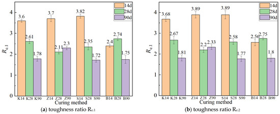 The toughness ratios Re.1 and Re.2 under different curing methods decrease with increasing age (Figure 9). This is because at a longer age, the matrix strength is higher, the bonding ability between the fiber and the interface is stronger, the number of fiber fractures when pulled out is greater than at shorter ages, and the deformation ability is weakened, resulting in a decrease in toughness. At the age of 90 days, the order of toughness ratios (Re.1 and Re.2) from high to low is steam curing, natural curing, standard curing, and sprinkler curing, consistent with the results of the four-point flexural test. This indicates that toughness is a comprehensive index for evaluating energy dissipation capacity and deformation capacity. The ultimate flexural load of ECC under steam curing is high, and the energy absorbed by cracking is substantial. Although the ultimate flexural load of ECC under natural curing is not high, the deformation ability is strong and the ultimate flexural deflection is the largest. Therefore, ECC under steam curing and natural curing are superior in toughness compared to ECC under standard curing and sprinkler curing.