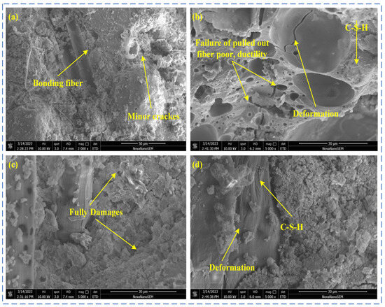 The cement hydration products, local crack sections, and fiber pull-out damage in the specimens were observed using the Field Emission Scanning Electron Microscope (Hitachi Ltd., Tokyo, Japan). This equipment offers an image resolution of 0.8 nm and operates within an acceleration voltage range of 0.5 to 30 kV. The microscope provides a magnification capability ranging from 20 to 1,000,000 times, enabling detailed examination and analysis of the microstructural features and damage mechanisms within the specimens.