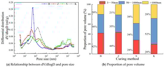 The mercury intrusion test in this study utilized the American Mac AutoPore IV 9500 produced by McMurray Tick (Shanghai) Instrument Co., Ltd. (Shanghai, China). This equipment is capable of generating a maximum pressure of 60,000 psia and can measure pore sizes within the range of 3.0 nm to 1000 μm. The sample size used for testing was approximately controlled at 20 mm3, ensuring consistent and accurate analysis of pore characteristics such as pore volume and size distribution within the specimens