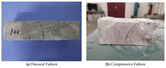 The tests were conducted in accordance with the standard ‘Cement mortar strength test method’ (GB/T 17671-2021) [43]. Cuboid specimens measuring 160 mm × 40 mm × 40 mm were selected, with three specimens tested per group. The testing was performed using the Jinan Tianchen cement flexural and compressive integrated testing machine. During the flexural tests, the forming surface of the specimen was positioned outward, and the loading speed was set at (50 ± 10) N/s for the flexural test, as depicted in Figure 4a. Following the flexural test failure, the compressive strength was measured on the half-cut prism specimens. The side of the specimen was chosen as the compression surface, with a loading area of 40 mm × 40 mm and a loading speed of (2400 ± 200) N/s, as illustrated in Figure 4b.