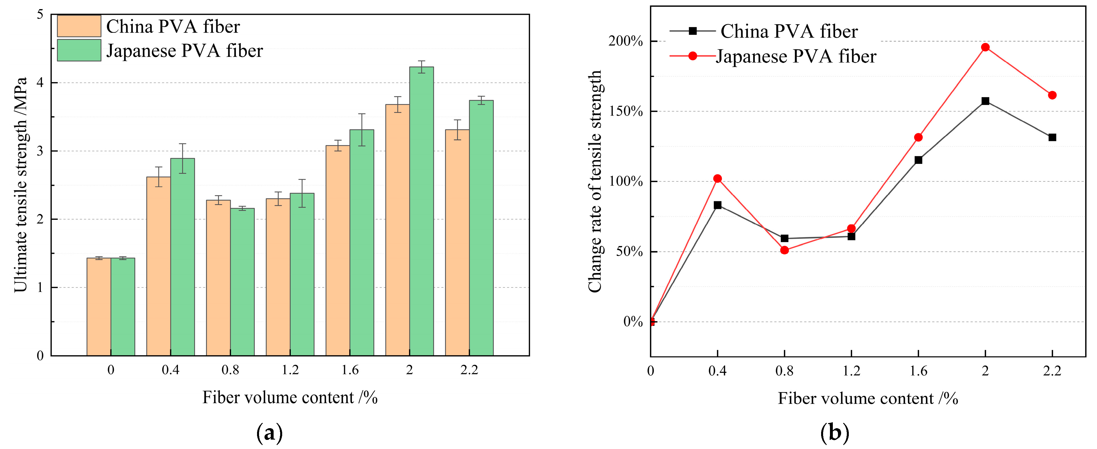 3.1.1. Effect of PVA Fiber Volume Content on Tensile Strength of HFRCC