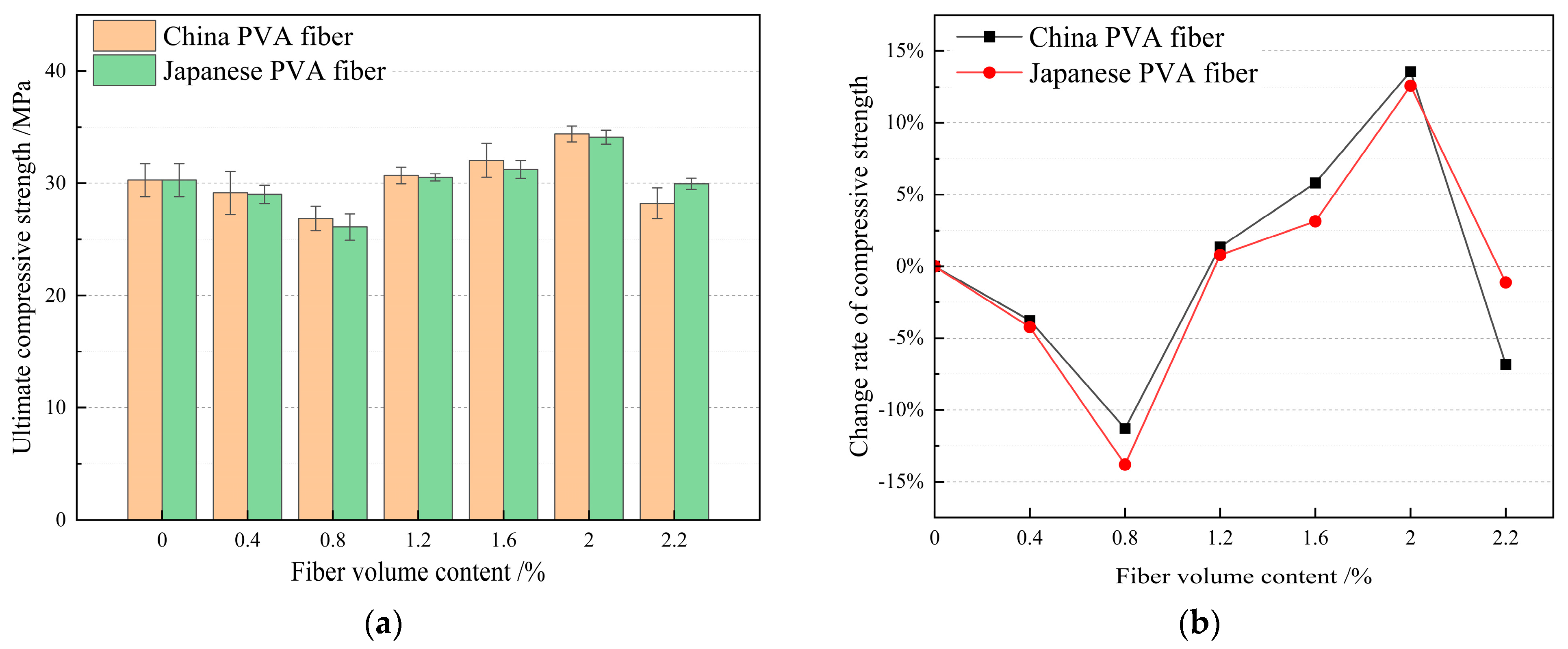 3.1.2. Effect of PVA Fiber Volume Content on Compressive Strength of HFRCC