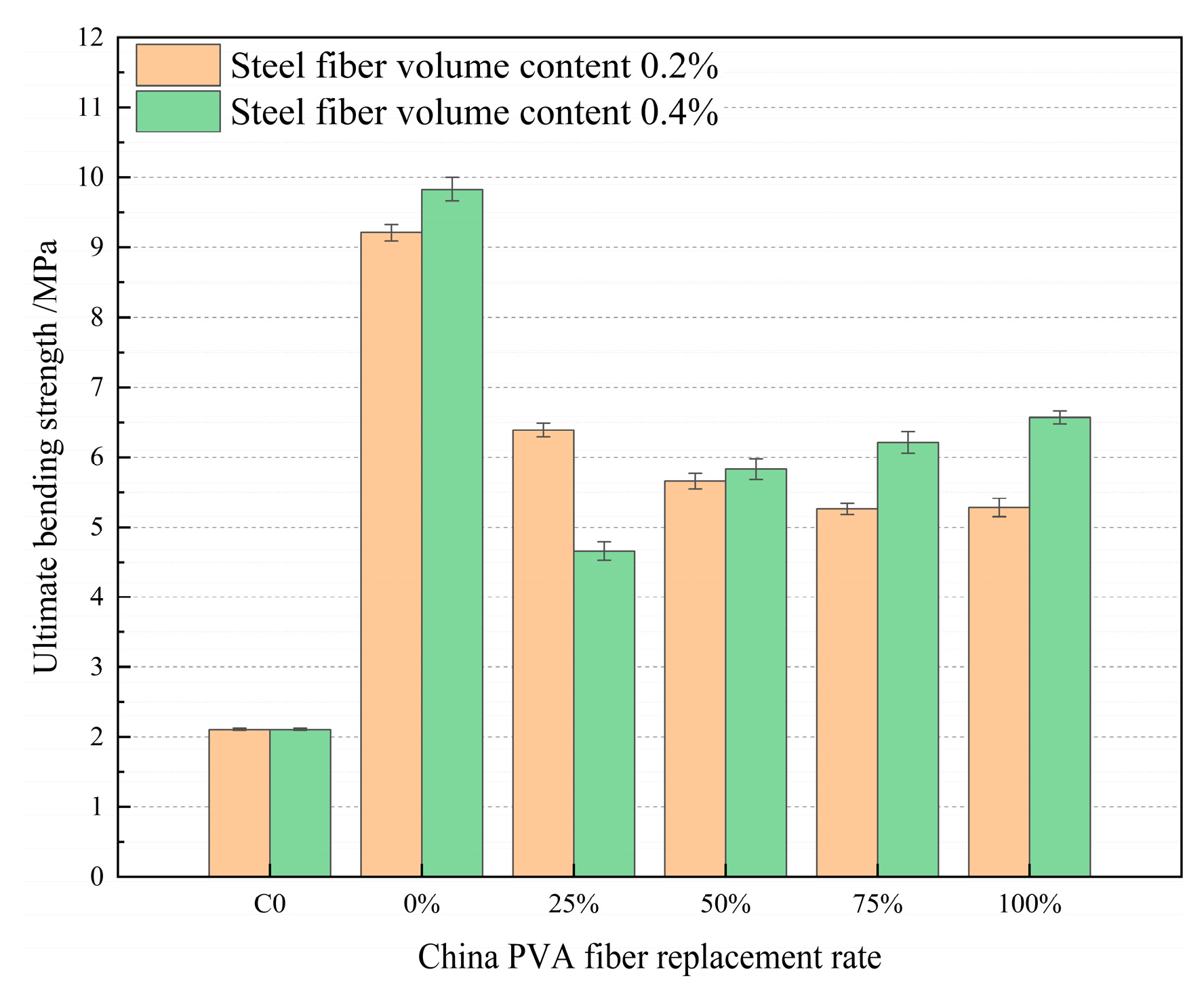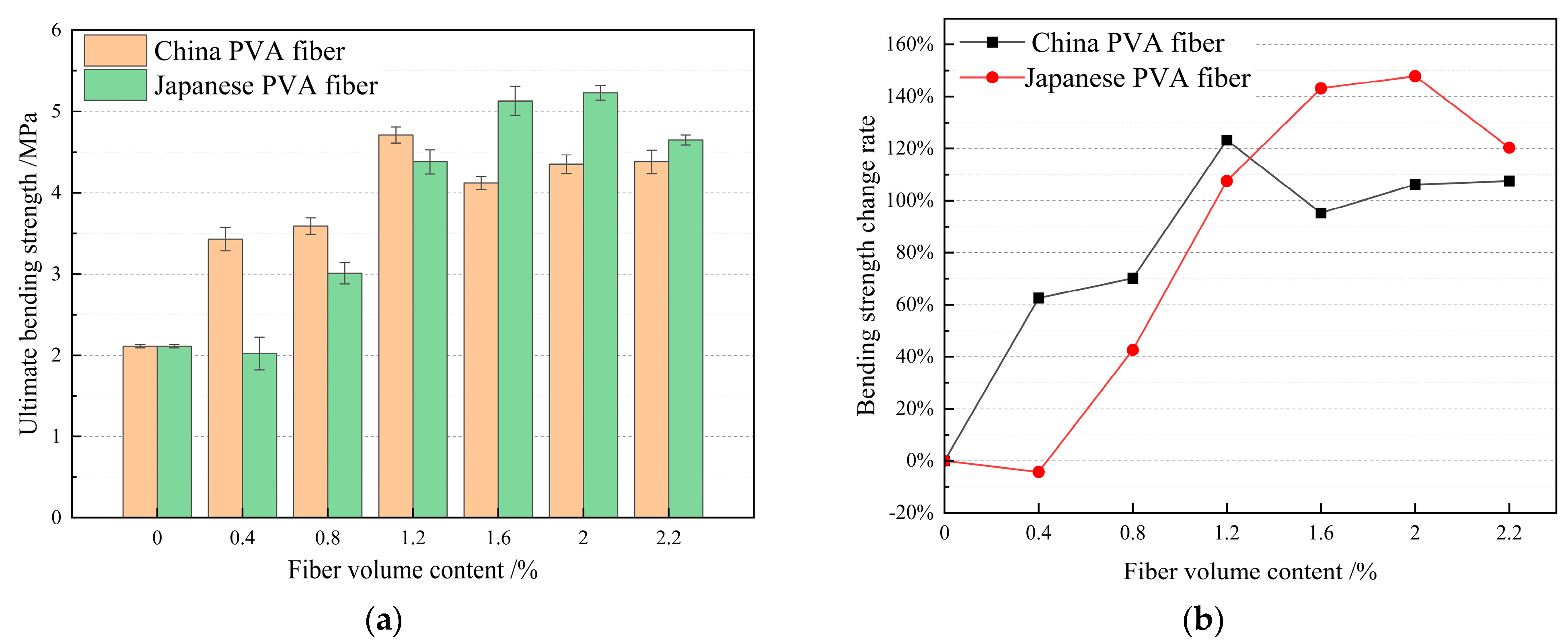 3.2.3. Effect of the Replacement Rate of PVA Fiber Produced in China at Different Volume Contents on the Bending Strength of HFRCC