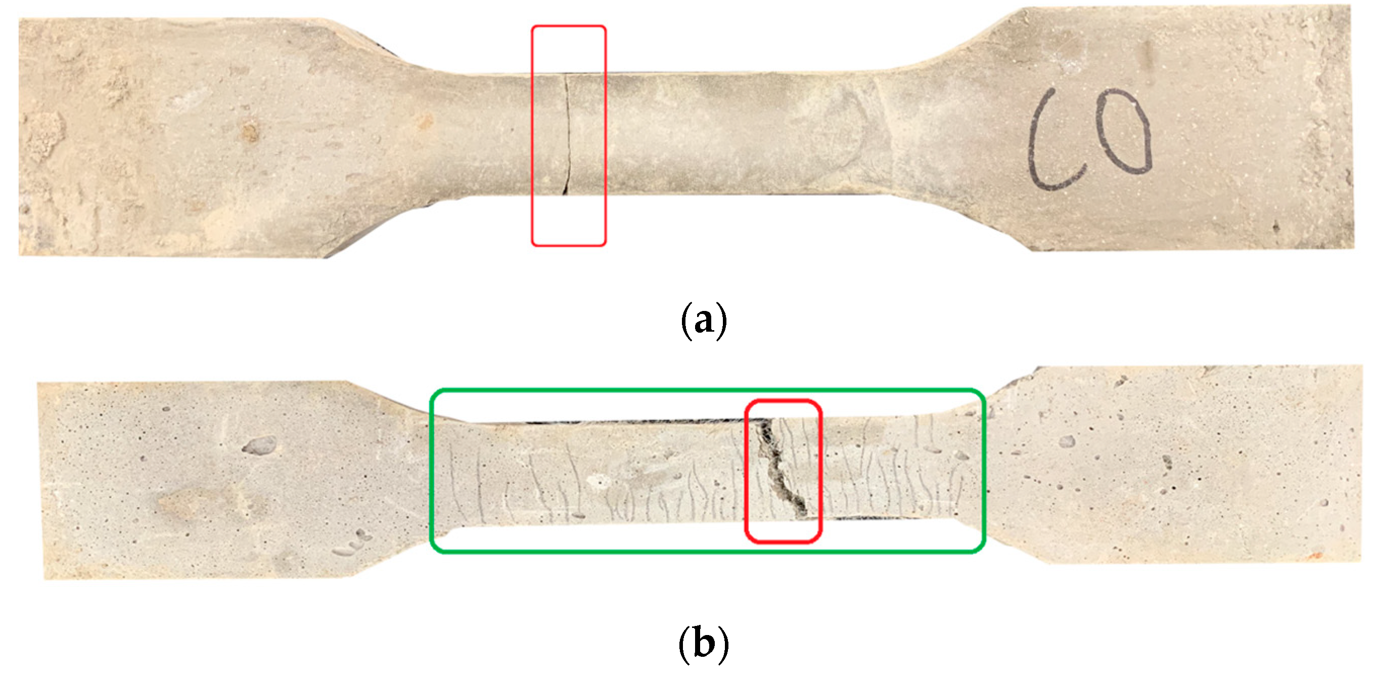 3.2.1. Effect of the Replacement Rate of PVA Fibers Produced in China on the Tensile Strength of HFRCC