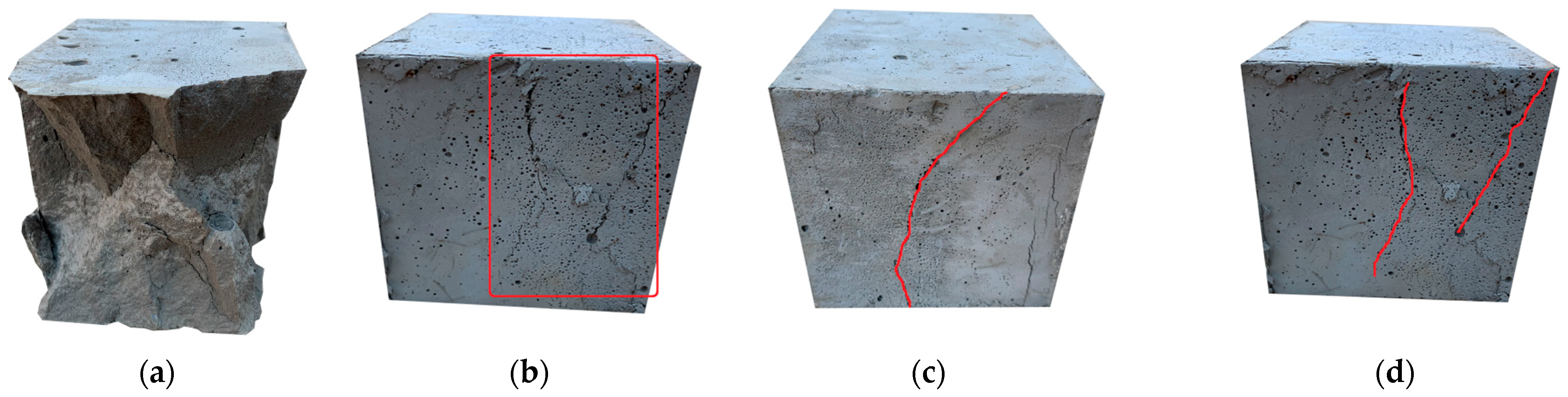 - Chen, G.; Zhuo, K.X.; Luo, R.H.; Lai, H.M.; Cai, Y.J.; Xie, B.X.; Lin, J.X. Fracture behavior of environmentally friendly high-strength concrete using recycled rubber powder and steel fibers: Experiment and modeling. Case Stud. Constr. Mater. 2024, 21, e03501. [Google Scholar] [CrossRef]