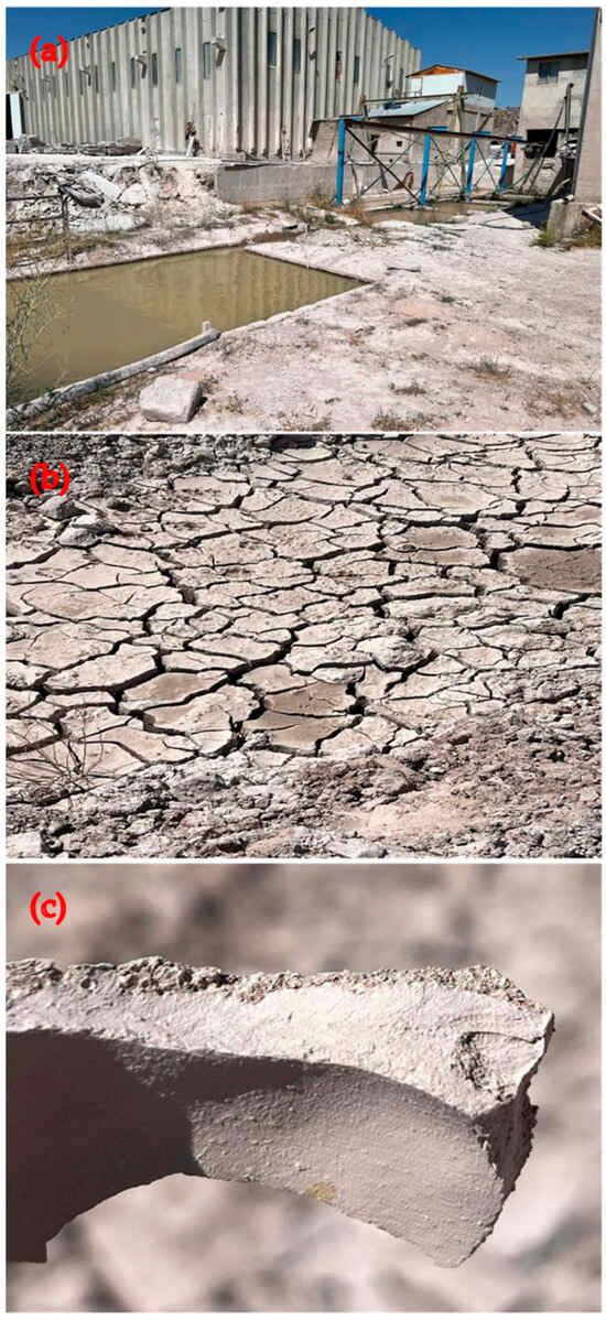 WAD collection area, (a) collection pool, (b) the state of receding water, (c) dried WAD.