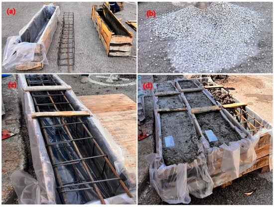 Preparation of RCBs, (a) preparation of molds, (b) materials, (c) reinforcement in the RCB, (d) setting up concrete.