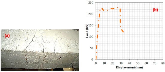 Figure 9 presents the test findings illustrating the effects of RCB with a 40% WAD rate. The deformation line exhibits a linear rise within the load range of 0–155.6 kN and reached the maximum capacity at 25.8 mm; then, the capacity was directly decreased. This specimen showed the least capacity among all specimens.