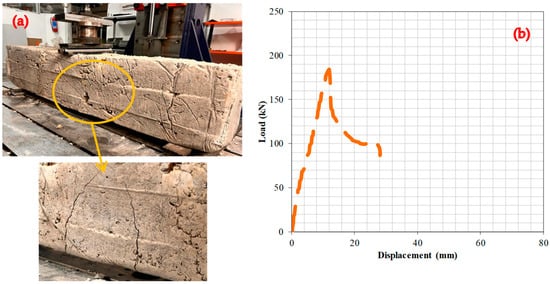In this section, the effect of a WAD rate of 30% on the bending attitude of the RCBs is given and examined in further detail. Figure 8 shows the detection of significant shear and perpendicular cracks in the RCB. Significant perpendicular fractures are located in the middle of the RCB in Figure 8, and it is crucial to determine the fracture attitude of RCBs containing 30% WAD on the basis of these fractures. The deformation line exhibits a linear relationship throughout the load range from 0 to 184.3 kN. At a load of 184.3 kN, a deformation of 11.9 mm was observed. Upon the application of a load of 184.3 kN, the deformation–load relationship of the RCB transitions from a linear to a nonlinear trajectory.