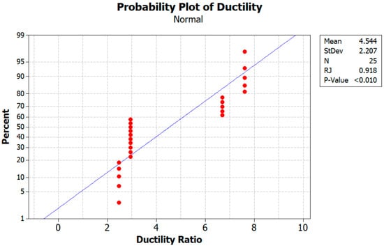 Furthermore, according to an analysis of the test findings, the load-carrying capability of the RCB decreases as the ratio of WAD in the mixture increases. Numerous other investigations in the literature are comparable to this one [9,10]. It is mostly because of the diluting of the cement that the efficiency factor drops with the amount of andesite present. This is a phenomenon that can hardly be counteracted by the modest pozzolanic activity of andesite [9]. Existing research demonstrates that the increase in porosity is directly linked to the substitution of WAD, which appears to be the underlying cause of the reduction in strength. In Figure 10, the probability of ductility is given. As observed from Figure 10, the mean value and standard deviation obtained were 4.544 and 2.207. Furthermore, in the relationship between ductility and stiffness, the maximum value of Pmax is found, as indicated by Table 4.