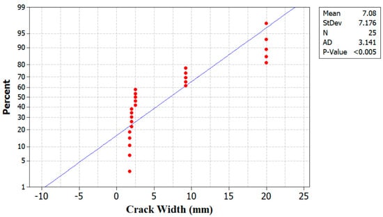 The failure mode of the tested beams is displayed in Figure 11. The crack width in the RCBs increased from 1.7 mm to 20 mm on average when the volume of WAD content was increased from 0% to 40%. Conversely, there is a noticeable rise in the quantity of cracks present in the beams, as shown in Figure 11. As the rate at which WAD is substituted into the mixtures increases, voids and weak spots are created locally in the cementitious matrix. As a result of the lack of adhesion at the cement–aggregate interface, these voids and weak spots can lead to the production of new cracks under load and the rapid propagation of pre-existing ones, which in turn reduces the load-carrying capacity [16]. The significant reduction in strength can also be attributed to the gaps in the cement matrix created by the WAD substitution, which cause stress concentration and decrease the effective stress area [16]. Table 4 provides the variations in load and deformation. A display of the probability of crack width can be found in Figure 12. Furthermore, it can be noted that the mean value and standard deviation using Minitab [35] are calculated to be 7.08 and 7.17, respectively. Additionally, the scale effect is critical for the debonding mechanism of failure, and further testing on full-size beams is needed to validate the consistency of the present models at all relevant scale levels [36,37].