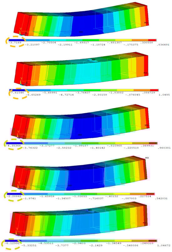 Figure 14 provides the results of the RCBs for maximum deflection. The RCB’s flexing and deformation attitudes are displayed as contour plots in Figure 14. Noticeable disparities in fractures and deformations can be observed when comparing 3D FEM evaluations. As seen in previous FEMs, the midpoint of the RCB exhibited the highest estimated deviation in this particular model.