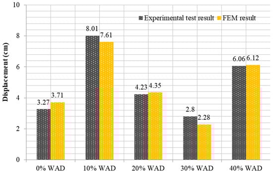 Comparing the findings obtained from the tests with the results obtained using the FEM is the focus of this section. As observed in Figure 14, upon examining the test results, it becomes evident that the maximum deformation for RCBs containing 0% WAD is measured as 3.27 cm. This value was obtained as 3.71 cm in the FEM. As a result, it is evident that 3D FEM results are established for the test outcomes of RCBs with 0% WAD. It appears that stress distributions in the RCB under loads are extremely similar to those discovered from the test outcomes, as shown in Figure 15. At the middle of the RCB with a 10% WAD rate, the maximum deformation is 8.01 cm. Based on the results of the test, a maximum deformation of 7.61 cm was observed, as shown in Figure 15. This outcome serves as clear evidence that the test results align with the predictions made using 3D FEM. It is evident that there is a clear recognition of the close proximity between the numerical and experimental fractures. With 20% WAD included, a 3D FEM was carried out for the RCBs. As seen in previous FEMs, the midpoint of the RCB exhibited the highest estimated deviation in this particular model. Conversely, the edge points of the RCBs containing 20% WAD had the lowest deviation. The maximum deflection of 4.23 cm was measured in the middle of the RCB. According to the results, a maximum deformation of 4.35 cm occurred in the middle of the RCB for 3D FEM analysis. Additional 3D FEM evaluations, including 30% and 40% WAD, were performed for the RCBs. For 30% and 40% WAD, respectively, the RCB deviation levels in FEM were 2.28 cm and 6.12 cm. The experimental testing revealed that the RCBs containing 30% and 40% WAD exhibited maximum deviations of 2.80 cm and 6.06 cm, respectively. Figure 15 presents a visual representation of both the empirical findings from the experimental tests and the 3D FEMs on the maximum displacement observed in the RCBs. In addition, Figure 15 presents the relationship between the results of the experiment and the FEM. The variability in material characteristics, such as the contact algorithm and yield strength on the contact surfaces, is assumed to be the primary explanation for the significant disparity between the experimental findings and the theoretical predictions.