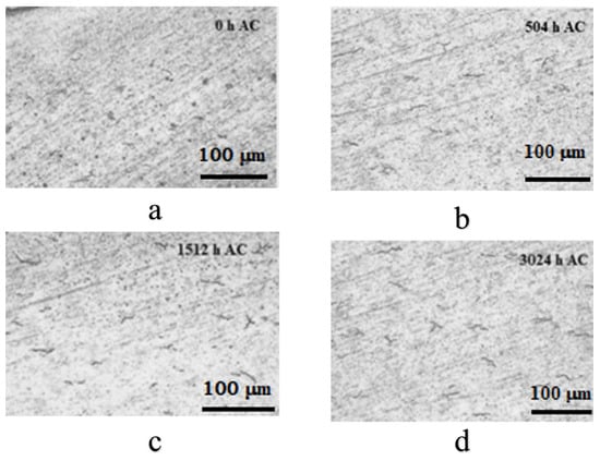 Vickers microhardness results indicate a slight increase with the autoclave testing time [29]. However, we noticed that the values are located on a limited domain (202–209 Kgf/mm2), which demonstrates that there were no induced significant modifications during the autoclave testing.