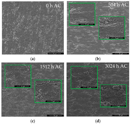 From Figure 6, it is noticed that the coatings are still adherent, and they are keeping the initial morphological characteristics during the autoclave testing. There were no identified areas with spallation, cracking, or possible forms of localized corrosion.