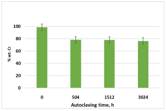 After 504 h of autoclave testing, it was observed that the higher Cr concentration decreased, by around 20%. During the next autoclave testing period, it was noticed that the minor Cr concentration decreased, by about 1–2%. Consequently, it can be concluded that the coatings performed well in the corrosion testing environment.