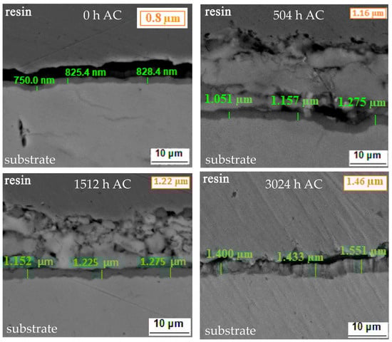 As Figure 4 shows, a change in the oxide color with autoclave testing time can be observed. According to the specialized literature [27], it was noticed that the gold color indicates a thickness of less than 100 nm of the Cr2O3 layer, and the change to purple/blue is given by the increase in the thickness of the chromium oxide layer (of the order of hundreds of nanometers).
