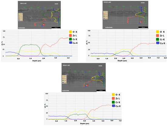 After 504 h of autoclave testing, the spectra show that in the region corresponding to chromium coating, chromium is found in a higher concentration than oxygen. It also can be seen that both Cr and O present stable behavior in this area. For the following test periods, the change in the ratio of recorded concentrations was identified, in favor of increasing the concentration of oxygen compared to that of chromium, which indicates the acceleration of the oxidation process at the coating–medium interface, under the test conditions.