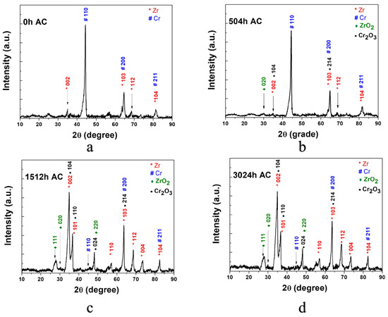 Diffraction patterns of Cr coatings deposited on Zircaloy-4 substrate by MS method, after various autoclave testing periods: 0 h (a), 504 h (b), 1512 h (c), and 3024 h (d).