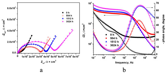 Based on the Bode diagrams (Figure 12b), high impedance values were determined for all autoclaved samples for distinct periods, which demonstrates a higher corrosion resistance compared to the as-coated sample.