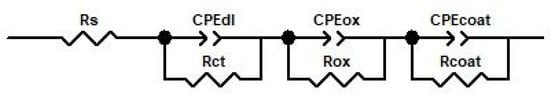 The equivalent circuit model used to fit the experimental EIS data is shown in Figure 13. The following is a description of the equivalent circuit’s components: Rs stands for solution resistance between the electrode and the electrolyte; CPEox stands for the continuous phase element of the oxide layer; oxygen layer resistance is represented by Rox; coating resistance is represented by CPEcoat; coating resistance is represented by Rcoat; double-layer resistance is represented by CPEdl; and charge transfer resistance is represented by Rct.