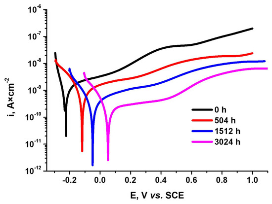 Potentiodynamic measurements were made at room temperature at a scan rate of 0.5 mV·s−1 and a range from −250 to 1000 mV relative to the open-current potential (OCP), in a specific primary circuit solution (LiOH solution, pH 10.5). It is remarked that the “scan rate” had a significant effect in the attained distortions in the potentiodynamic polarization curves, as previously reported in study [17]. The behavior of the material with generalized corrosion was observed by open-circuit potential measurements in the same electrolyte.