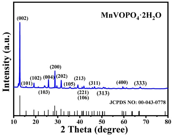 The X-ray diffraction pattern of MnVOPO4·2H2O matches with the JCPDS: 00-043-0778 card (a = 6.2034, b = 6.2034, c = 13.8140, and α = β = γ = 90°), which demonstrates its high purity (Figure 2). In addition, it shows preferential growth along the (002) crystal surface, which accords with the growth law of 2D layer materials and the existing literature [24,25]. Moreover, the average grain size of the main diffraction peaks is distributed in the range of 50–60 nm (Table 1). In general, this small grain size can reduce the diffusion path of zinc ions and promote the mass transfer process.