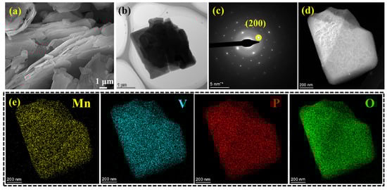 Moreover, the SEM image demonstrates that MnVOPO4·2H2O shows a layered stacking structure at the micron scale, with a blocky distribution of materials. Each piece is stacked in layers with an approximate size of 2 × 2 × 0.1 μm (Figure 3a,b). Furthermore, it shows a layered stacking profile structure, and each layer has the same width, showing a certain rule. This block-distributed layered morphology may be conducive to the penetration of the electrolyte and promote the diffusion kinetics of zinc ions. In addition, the pattern of electron diffraction in selected regions was characterized by selected area electron diffraction (SAED) (Figure 3c). The electron diffraction patterns show that MnVOPO4·2H2O has the properties of a single crystal and has a tetragonal structure. The diffraction pattern calibration of the (200) crystal surface is consistent with the XRD results, which plays a complementary role in the high purity of the synthesized MnVOPO4·2H2O [24,25,26]. The TEM results further demonstrate this structure. The manganese, vanadium, phosphorus, and oxygen are uniformly distributed (Figure 3d,e).