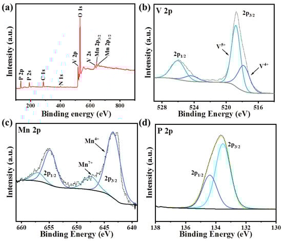 An XPS full-spectrum analysis of MnVOPO4·2H2O was carried out, in which the target was Al Kα. The full spectrum was corrected during the data processing using the polluting carbon binding energy of 284.8 eV. The test results show that the synthesized sample contained only four elements, V, P, O, and Mn, which demonstrated the high purity of the synthesized sample (Figure 4a). In Figure 4b, the V 2p 3/2 and V 2p 1/2 peaks of the sample confirm that the vanadium element was in the mixed-valence state (V4+/V5+), which corresponds to the V-O bond [10,11]. Moreover, this mixed state may help obtain higher electrochemical activity, lower polarization, faster ion diffusion, and higher electrical conductivity for MnVOPO4·2H2O [27]. Figure 4c also shows a spin–orbit splitting in the Mn 2p region for manganese. The difference between the peak corresponding to the 2p 1/2 orbit and the peak corresponding to the 2p 3/2 orbit is 11.2 eV. Based on this, two groups of peaks can be obtained via sub-peak fitting. When the binding energy of the Mn 2p 3/2 orbital corresponds to 642.8 eV, it corresponds to Mn-3+ (Mn-O), which is consistent with the XRD results. When this value is 647 eV, it corresponds to the highest oxidation state of manganese, heptavalent manganese, because one of the synthetic byproducts of MnVOPO4·2H2O is HMnO4. The appearance of this peak comes from a small amount of HMnO4 residue on the sample surface rather than the unfinished KMnO4. Figure 4d also shows a spin–orbit split in the 2p region, where the difference between the peak corresponding to the 2p 1/2 orbit and the peak corresponding to the 2p 3/2 orbit is 1 eV. Moreover, the fitting peak corresponding to the P 2p 3/2 is 133.5 eV, which is the binding energy of phosphorus in a typical phosphate group.