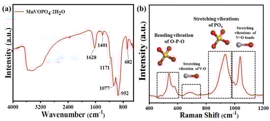 (a,b) FT-IR and Raman spectrogram of MnVOPO4·2H2O sample.