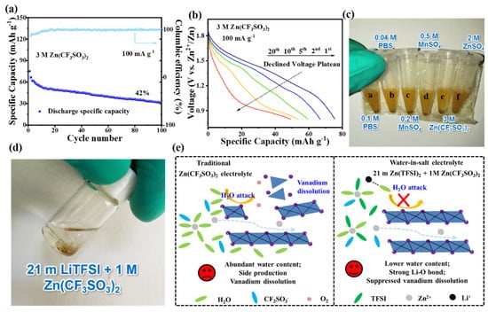 (a,b) The cycling performance and corresponding discharge curves at 0.1 A g−1. (c,d) Optical photographs of dissolution of MnVOPO4·2H2O in 3 M Zn(CF3SO3)2 and other additive-modified electrolytes after one week, as well as 21 m LiTFSI + 1 M Zn(CF3SO3)2 after two months. (e) Schematic illustrations of vanadium dissolution in traditional and “water-in-salt” electrolytes.