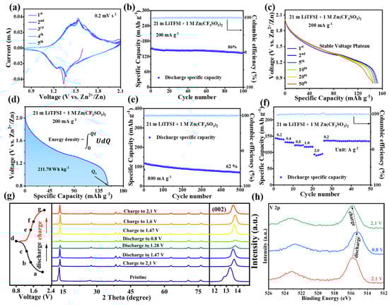 (a) CV curves in the first 5 cycles. (b,c) Cycling performance and corresponding discharge curves at 0.2 A g−1. (d) Energy density and 1st discharge curve. (e) Cycling performance at 0.8 A g−1. (f) Rate performance at different current densities. (g) The ex situ XRD pattern during the 2nd cycling process and the detailed change in the typical (002) plane. The letters a–g represent charge to 2.1 V, discharge to 1.47 V, discharge to 1.28 V, discharge to 0.8 V, charge to 1.47 V, charge to 1.6 V, and charge to 2.1 V, respectively. (h) XPS results for V 2p in fully discharged and charged states.
