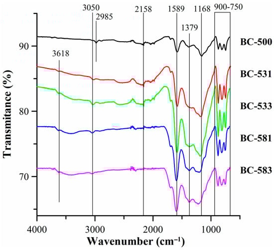 The presence of surface functional groups was also confirmed by the FTIR-ATR analysis (Figure 1). The small band occurring at 3618 cm−1 for the samples subjected to the mechanochemical modification corresponded to the symmetrical and asymmetrical tensile vibrations of the O-H groups []. The band at ~3050 cm−1 indicated the tensile vibrations of C-H in the aromatic rings []. Occurring at 1589 cm−1, the band was associated with the vibrations of C=C or those of the C=O group present in the oxygen functional groups, such as ketones, carboxylic acid groups, and amides []. The bands in the range of 1500–1100 cm−1 were associated with the presence of C=O carbonyl groups []. The bands at 1379 cm−1 corresponded to the vibrations of the carboxyl group O=C-O [], which was confirmed by the Boehm method. The bands occurring in the area of 900–750 cm−1 were associated with the C-H deformation vibrations outside the plane of the aromatic rings []. For all modified biocarbons, an increase in the intensity of the bands associated with the oxygen-containing groups was observed, which was confirmed by an increase in the content of surface oxygen functional groups for the studied materials.