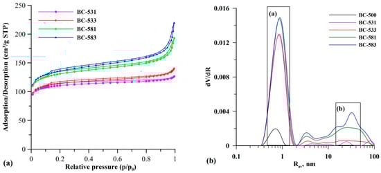 Figure 2 shows the isotherms of low-temperature nitrogen adsorption/desorption (Figure 2a) and pore volume distribution curves (Figure 2b) for the biocarbons subjected to mechanochemical activation. The shape of the isotherms was intermediate between types I and IV after IUPAC. In the low relative pressure range (<0.1), the sorption capacity increased rapidly as p/p0 increased. This was due to strong adsorption in the micropores. As the relative pressure increased, the isotherm increased steadily in the medium- and high-pressure areas, and the adsorption and desorption curves began to become inconsistent. This resulted in the formation of a hysteresis loop, indicating the formation of a small number of mesopores []. It can be seen that the isotherms were arranged higher and higher (Figure 2a), which suggests that both the extension of the modification time and the increase in the speed of rotation of the mill resulted in better surface development (Figure 2a). The pore volume distribution curves (Figure 2b) indicated an intense increase in the volume of pores with a dominant radius of ~0.8 nm (Figure 2b, inset a) due to the mechanochemical modification and the formation of a mesoporous structure (Figure 2b, inset b), with a simultaneous increase in the value of the mean pore radius (Rav; Table 3) of the modified biocarbons. The greatest development of the mesoporous structure was observed for the samples milled at 800 rpm (BC-581 and BC-583).