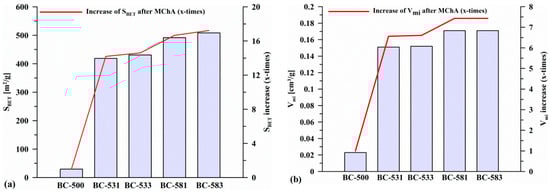 Changes in SBET (a) and Vmi (b) of the initial and mechanochemically activated biocarbons.