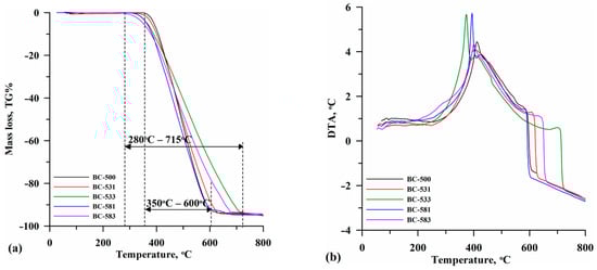 Thermal analysis allowed the biocarbon thermal stability assessment (Figure 5). The TG% curves indicated that the thermal degradation occurred in one stage. It started at approximately 350 °C for the baseline BC-500 and approximately 280 °C for the activated biocarbons (Figure 5a). The lower temperature of the onset of thermal decomposition of activated biocarbons could be due to the reduction of biocarbon particles as a result of mechanochemical milling, which improved heat transfer and reduced thermal stability []. Faster burning of small biocarbon particles could be the cause of the intense maximum on the DTA curve observed for materials milled for 3 h (BC-533 and BC-583; Figure 5b). The complete decomposition of BC-500 was found at a temperature of approximately 600 °C. The activated biocarbons, especially those ground for 3 h (BC-533 and BC-583), were more thermally resistant, and their decomposition was over at ~700 °C (Figure 5).