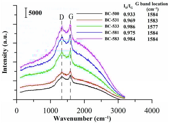 Raman spectroscopy was used to determine the bond type, size of domain, and internal stresses in the amorphous or nanocrystalline carbon materials. Typically, carbons are characterized by wide bands at 1300–1600 cm−1. The D-band (~1350 cm−1) corresponded to the breathing mode vibrations in the aromatic carbon ring of the nanocrystalline carbon structures. However, the G-band (~1580 cm−1) originated from the stretching vibrations of sp2 carbon in rings and chain structures. The main parameters determining the type of structure of the carbon material were the position of the G-band and the intensity ratio, ID/IG (Figure 6). Based on the relationship between these values, one can state the content of the sp3 phase and the type of structure prevailing in the biocarbon []. No change in the position of the bands was observed. However, the peak intensities increased slightly. This indicates that the mechanochemical treatment resulted in the formation of biocarbon particles with large structural defects []. The calculated ID/IG ratios (Figure 6) close to 1 indicate a large number of such defects in the obtained materials. This ratio increased with the grinding time and rotation speed increasing.