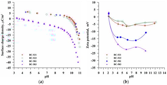 Figure 7 presents the pH impact on the surface charge density (Figure 7a) and zeta potential (Figure 7b) of the tested materials dispersed in the electrolyte. The intersection of the curves with the X-axis enabled the determination of the surface charge density and the zeta potential (ζ) values equal to zero. This enabled us to determine the points of zero charge (pzc) and isoelectric points (iep) of biocarbons. These points, the specific pH values, namely, pHpzc and pHiep, are characteristic of each adsorbent–adsorbate system []. The pHpzc and pHiep values are presented in Table 5. The pHpzc value for the sample BC-583 was 3.35, which indicates the biocarbon’s acidic nature and the basic nature of the remaining samples.