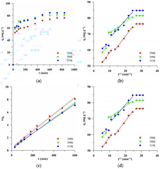 In the adsorption studies, three temperatures (298 K, 308 K, and 315 K) were applied, and methylene blue as an impurity. To discuss the processes taking place, the pseudo-first-order (PFO; Equation S1) and pseudo-second-order (PSO; Equation S2) models, as well as the Webber–Morris intraparticle diffusion model (IPD; Equation S3), were applied []. All details of the experimental conditions are included in the Supplementary Material.