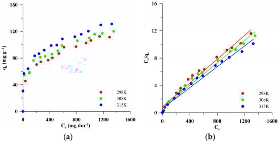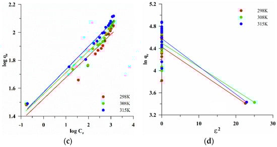 To describe the adsorption process, experimental adsorption data (Figure 9a) were fitted to the linear models of adsorption isotherms: the Langmuir (Figure 9b), Freundlich (Figure 9c), and Dubinin–Radushkevich (Figure 9d) ones. The initial data and the standard deviations are presented in Table S1 in the Supplementary Material (SM). With the temperature increases, an increase in the value of qe,exp was observed. This indicated that in this case, adsorption was an endothermic process. The maximum sorption capacity (130.98 mg/g) occurred at a temperature of 315 K. This could be due to the greater mobility of the dye particles at a higher temperature, which facilitates diffusion into the inner layer of the adsorbent. The parameters of the equations determined based on linear adjustments of the Langmuir, Freundlich, and Dubinin–Radushkevich isotherms are presented in Table 7. High values of the R2 > 0.97 suggested that the adsorption process was better characterized by the Langmuir equation. Determination of the adsorption energy (E; Table 7) based on the Dubinin–Radushkevich model was intended to find out whether the MB adsorption process on the tested adsorbent proceeded as physical or chemical adsorption. The E values smaller than 8 kJ/mol indicate physical adsorption, while those in the range of 8–16 kJ/mol point to chemical adsorption []. The obtained E values changed with the increasing temperature, being 3.33, 3.41, and 3.26 kJ/mol (Table 7). However, the obtained results did not indicate a type of adsorption. The small R2 coefficient (0.52–0.58) and significantly lower values (qm,cal) compared to the experimental data (qm,exp; Table 7) indicated that this model is not suitable for the interpretation of the tested process.